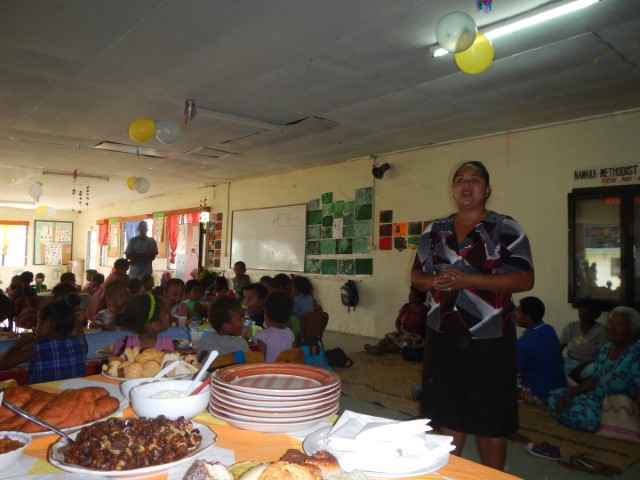Het ging wel goed denk ik. We werden binnengehaald en het officiΓ«le moment was daar. De kinderen werden aan tafel gevraagd, de snacks / eten werden voorgezet en drinken. er werd gebeden en gegeten. Mrs. Fuata gaf een speech waarbij er veel tranen vielen. Na het om krijgen van Salu werden cadeaus gegeven En nog meer hielden het niet droog.