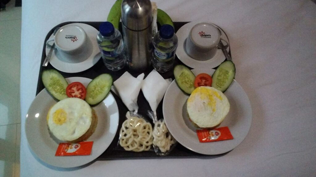Ontbijt is net geserveerd. rijst met ei bananen kroepoek en sambal. Ik vind het allemaal wel oké. Wanneer je mij goed genoeg kent, weet je dat ik alles eet.
